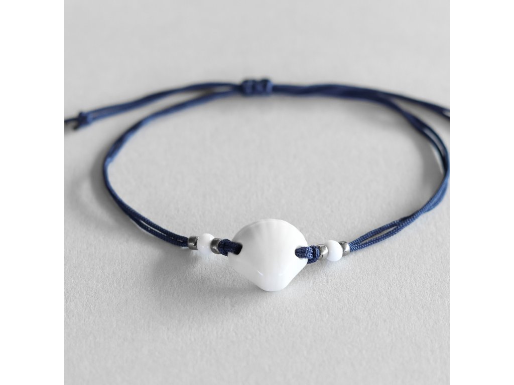 Základ náramku tvoří dvojitá nylonová šňůrka, na které je navlečen ručně modelovaný korálek z porcelánu o velikosti 13 x 13 až 20 x 20mm. Hlavní motiv doplňují skleněné korálky české výroby.